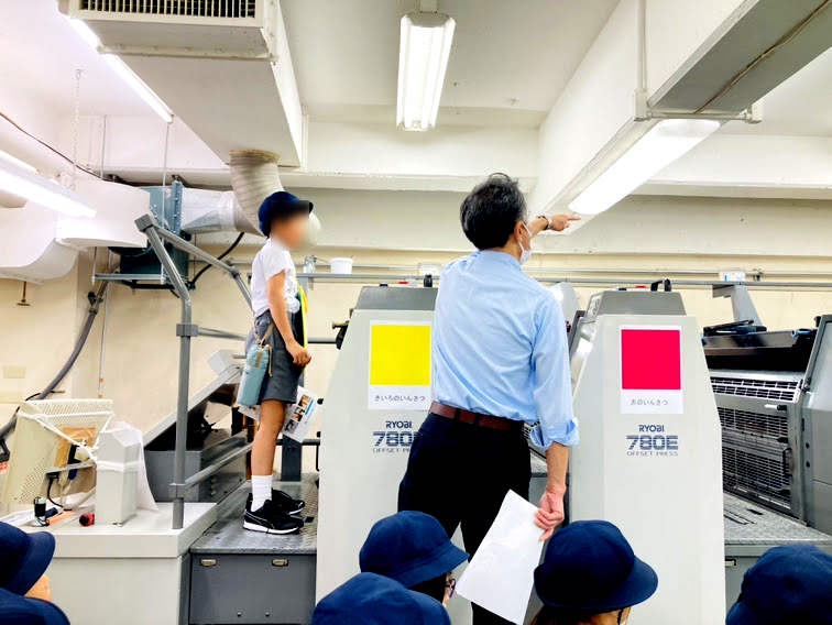 データ制作→製版→印刷→断裁・製本といった印刷物が出来上がる工程を、さまざまな機械を見ながら学んでいただきました。